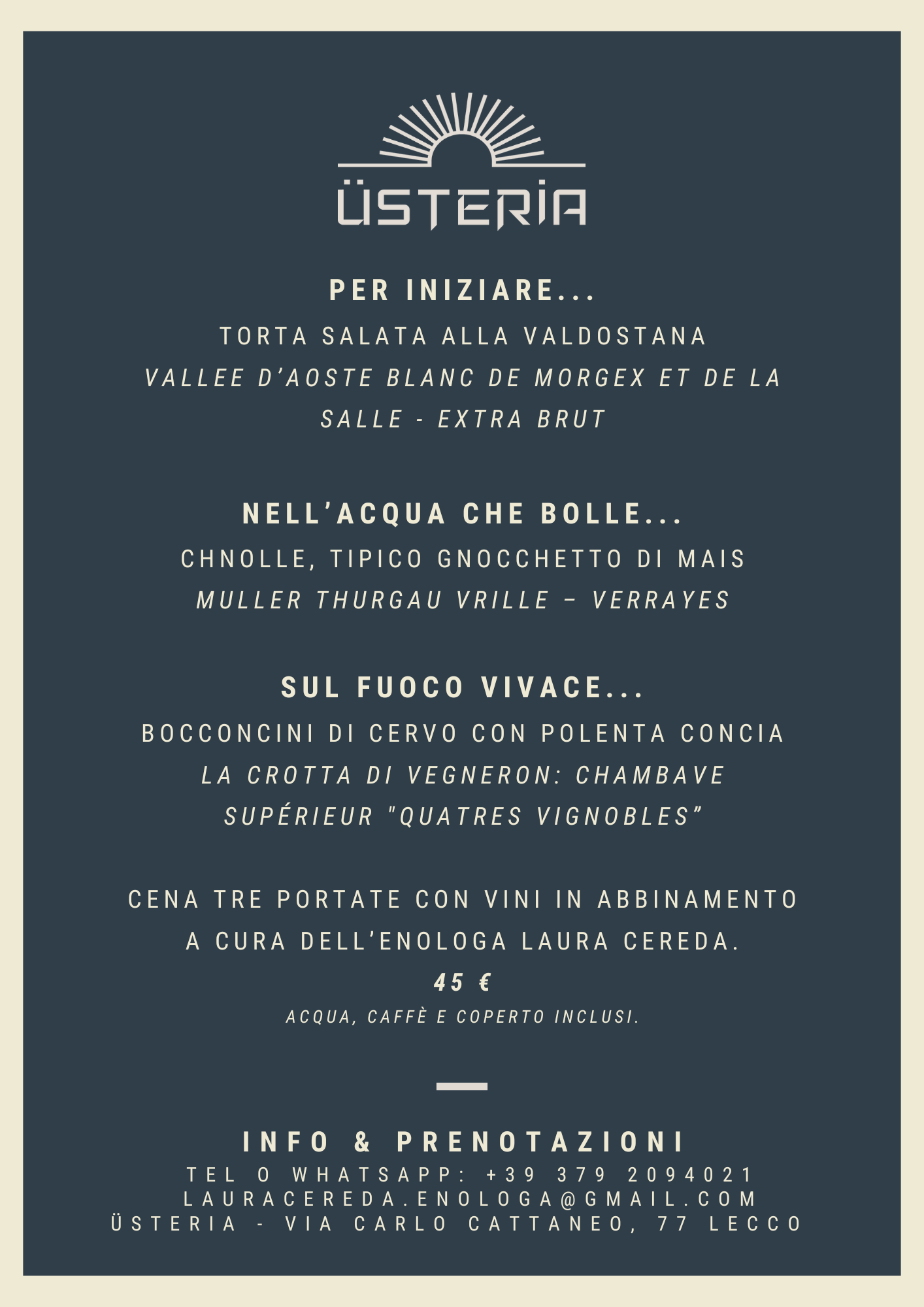 Üsteria non è solo un luogo dove mangiare bene, ma anche uno spazio vivo e dinamico, ricco di eventi pensati per arricchire la tua esperienza. Organizziamo periodicamente serate a tema, degustazioni guidate da esperti sommelier ed enologi e appuntamenti dedicati a chi ama scoprire nuovi sapori e approfondire la cultura del vino. Le nostre degustazioni sono occasioni uniche per esplorare la varietà e la ricchezza del panorama enologico italiano: dai grandi nomi alle cantine emergenti, ti accompagneremo in un viaggio sensoriale dove imparare, assaggiare e divertirsi insieme.